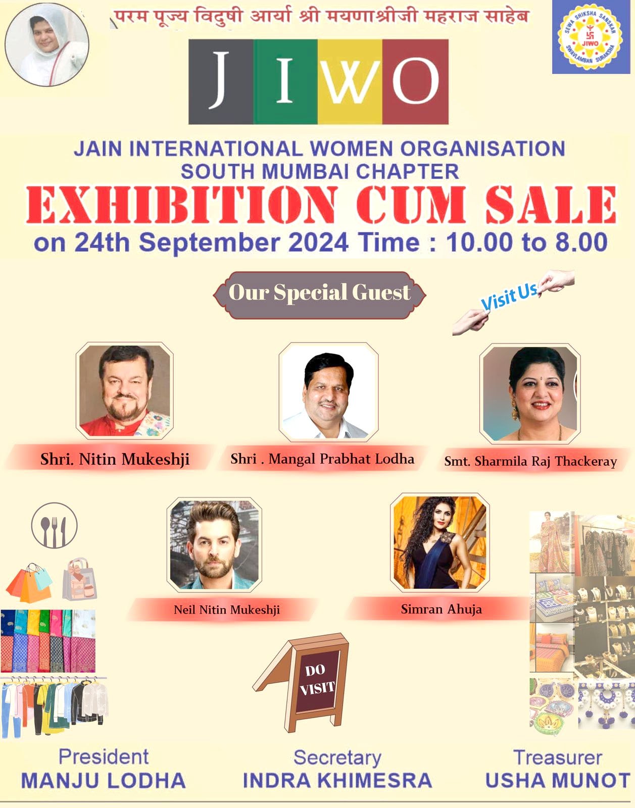 मुंबई। परम पूज्य विदुषी आर्या श्री मयणाश्रीजी महाराज साहेब की प्रेरणा से जैन इंटरनेशनल वुमेन ऑर्गनाइजेशन (जीओ) साउथ मुंबई चैप्टर द्वारा 24 सितंबर, मंगलवार को एग्जीबिशन कम सेल का आयोजन किया गया है। यह आयोजन प्रातः 10 से शाम 8.00 बजे तक अवसर बैंक्वेट, ज्योति स्टूडियो कंपाउंड, केनेडी ब्रीज, नाना चौक में किया गया है।