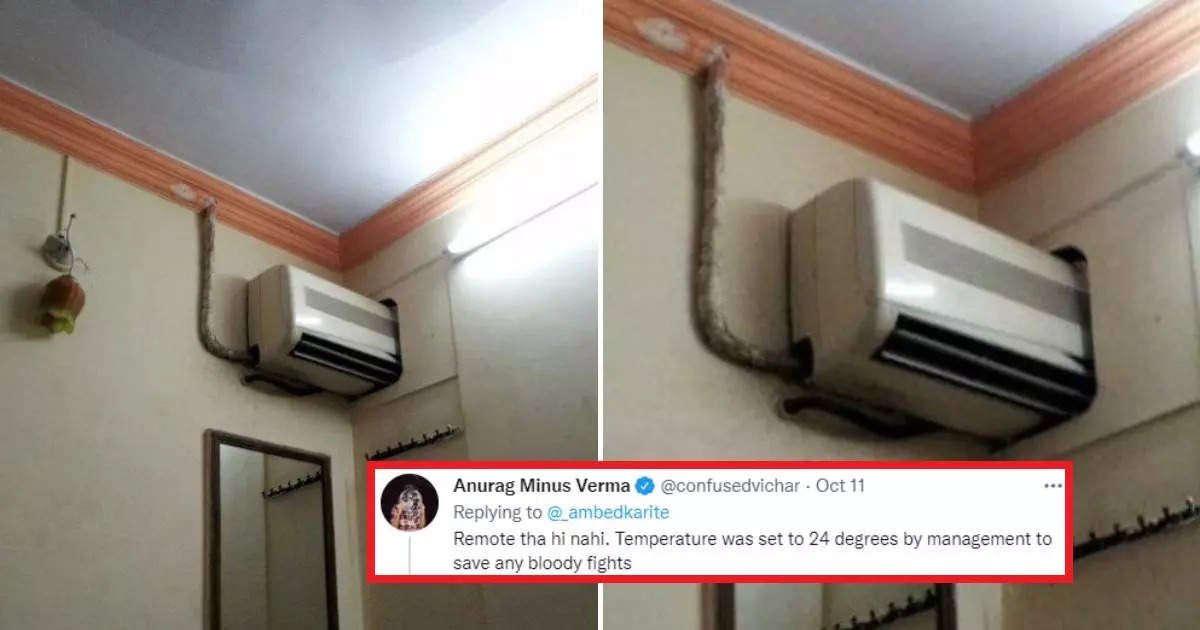 यह तस्वीर ट्विटर हैंडल @confusedvichar ने 10 अक्टूबर को शेयर की, जिसे अब तक 7 हजार से अधिक लाइक्स और पांच सौ से ज्यादा रीट्वीट्स मिल चुके हैं। अनुराग ने यह फोटो साझा करते हुए बताया कि उन्होंने साल 2011 में मुंबई में यह कमरा बुक किया था, जहां मैनेजर ने स्प्लिट एसी का वादा किया था। कमरे में स्प्लिट एसी था भी, लेकिन उसे दो कमरों में बांटा गया था। दरअसल, AC का आधा हिस्सा हमारे कमरे में था जबकि आधा बगल वाले कमरे में, जिसमें दो अंकल ठहरे हुए थे और उन्होंने सुबह चार बजे तक तेज आवाज में 'ऐ गणपत चल दारू ला' गाना बजाया था।